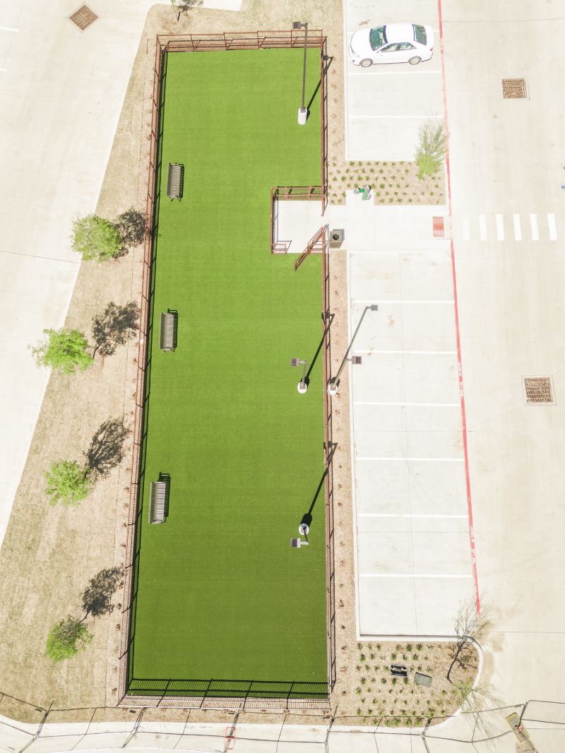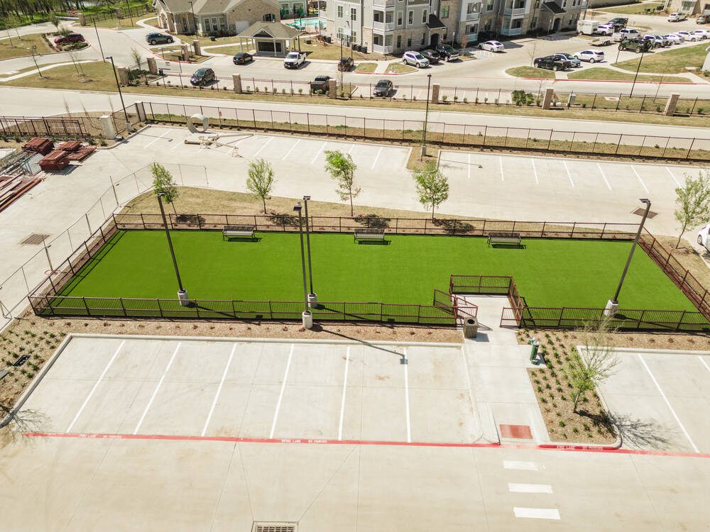 This complex did not have a lot of green space so they were looking for a spot within the parking lot that was centrally located for the residents for their dogs. We added a pet-friendly pet synthetic turf with bench space for the owners. It's a year-round space that will now not be muddy even in the winter.