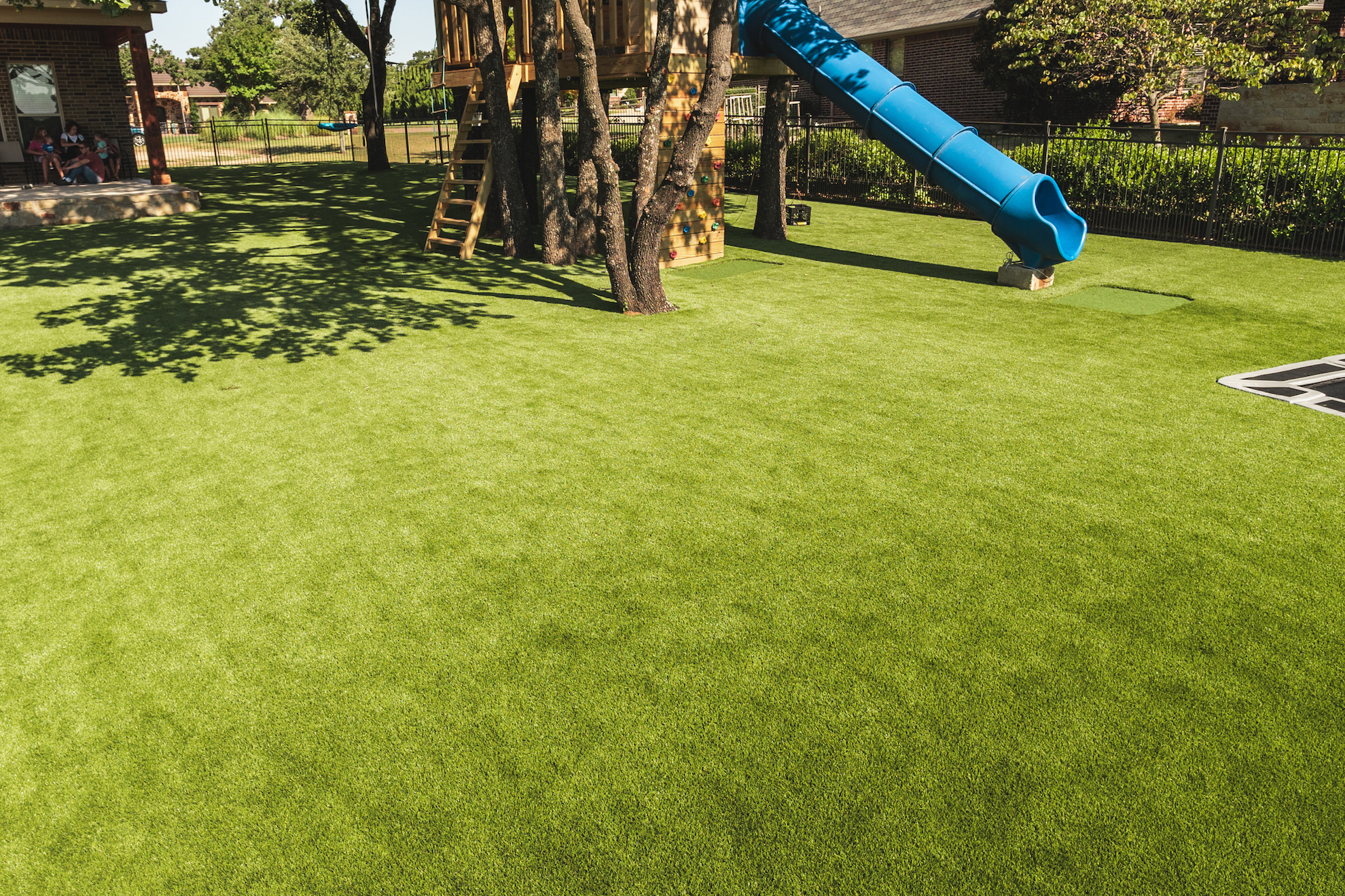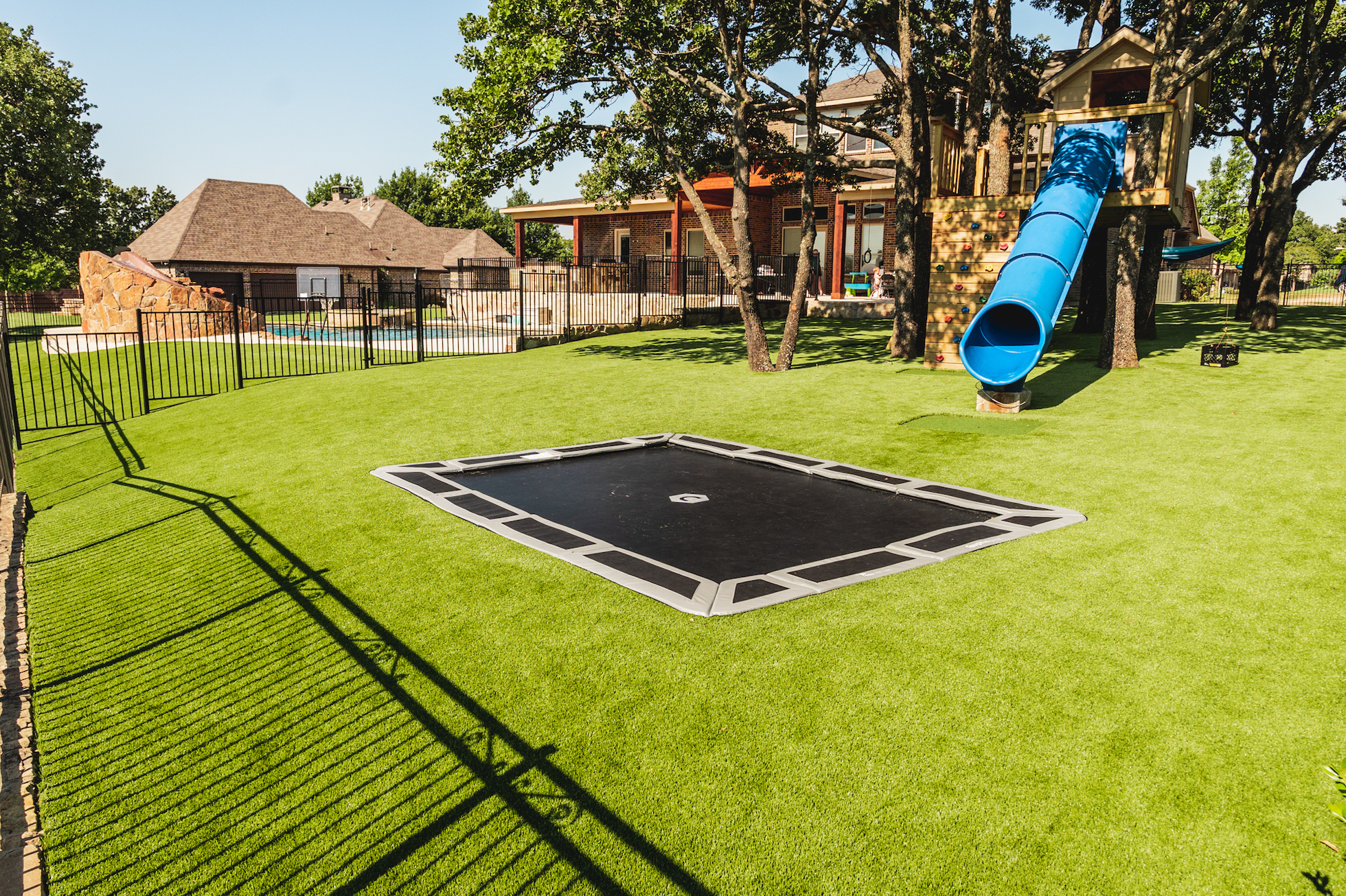 This client wanted turf in their backyard so that their kids had a clean and safe space to play. They had a small playground installed and opted to have the trampoline installed in the ground to reduce the risk of injuries. We were able to do all this without having to take out the trees that were providing shade to the area.